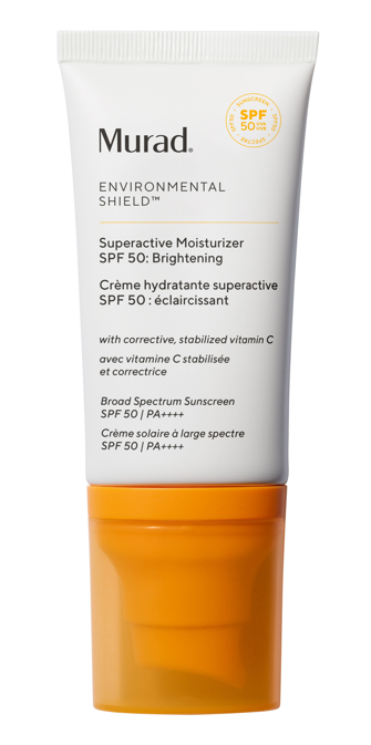 Superactive Moisturizer SPF 50: Brightening, de la línea Environmental Shield de Murad, es un humectante diario de alta protección solar que ayuda a iluminar y unificar el tono de la piel. Su fórmula avanzada con vitamina C estabilizada hidrata intensamente mientras protege frente a los rayos UVA / UVB, la luz azul y los daños causados por los radicales libres. Contribuye a mejorar la luminosidad, la textura y la apariencia general de la piel, dejándola más radiante y saludable. 50 ML