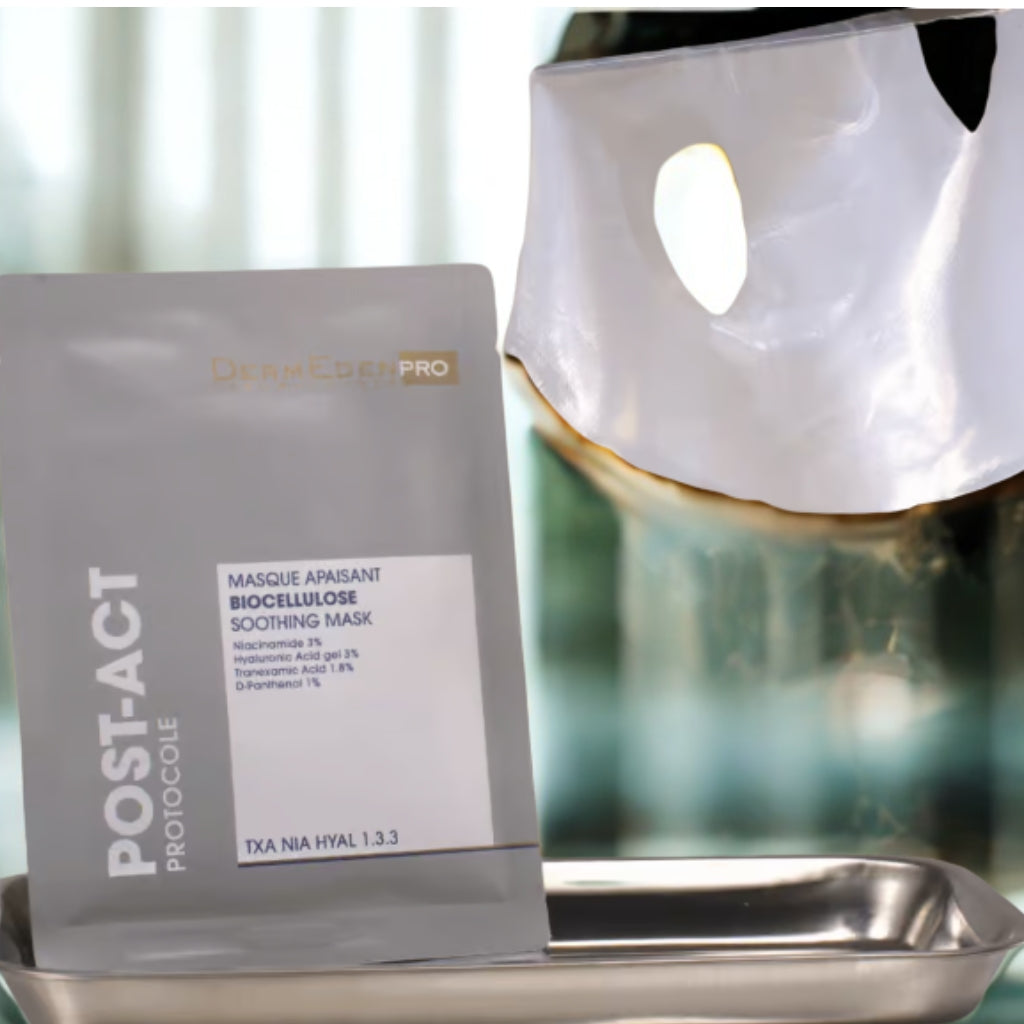 Mascarilla de Biocelulosa con activos, que se utilizan como calmantes, hidratantes y despigmentantes, post procedimientos de peeling, microagujas, láser, inyecciones, para reducir la temperatura, el enrojecimiento y el dolor de la piel.